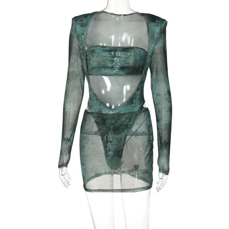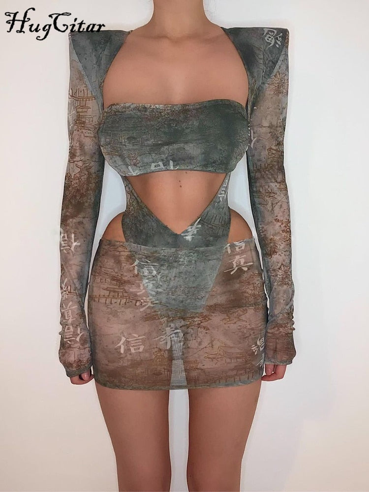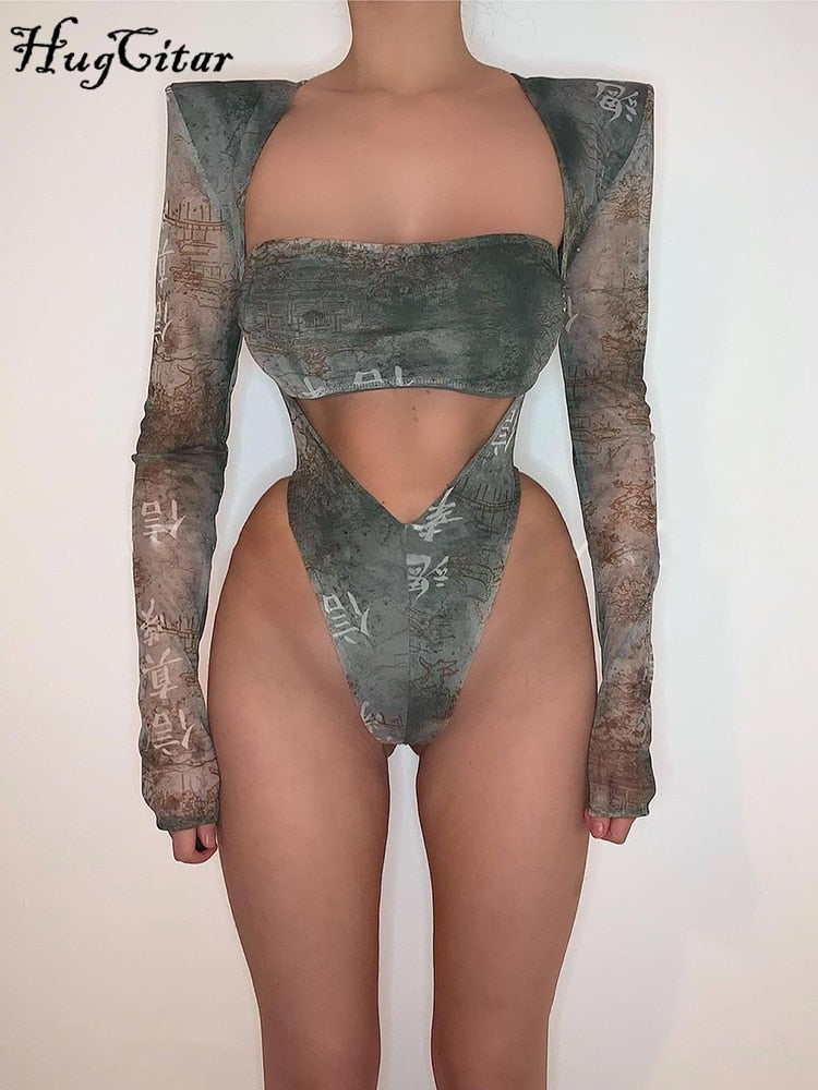 Hugcitar 2 Pieces Mesh Chinese Print Sleeves With Shoulder Pads Bodysuit Skirt Or Leggings Matching Set 2022 Sexy Elegant Y2K