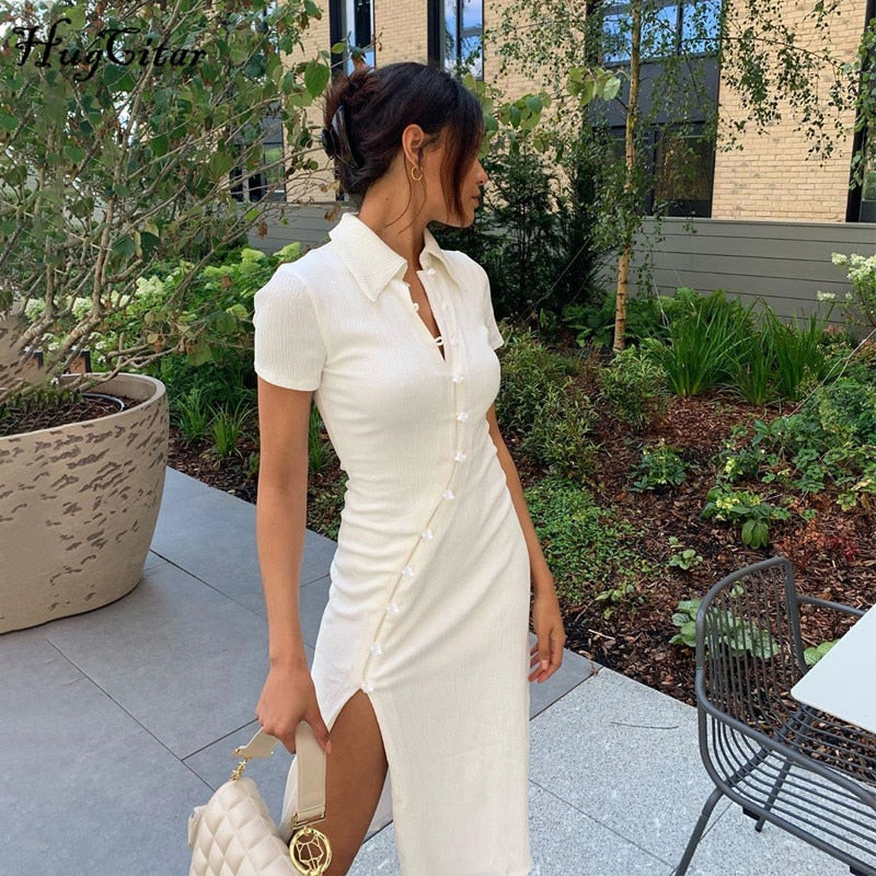 Hugcitar 2020 Short Sleeve Buttons Patchwork Slit Sexy Dress Autumn Winter Women Fashion Streetwear Outfits Party Elegant Wear