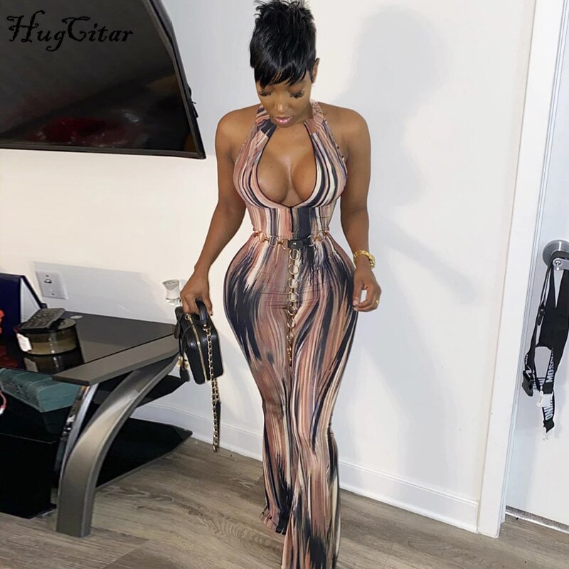 Hugcitar 2020 sleeveless print bodycon sexy jumpsuit spring women stretchy flare slim body streetwear club party outfits