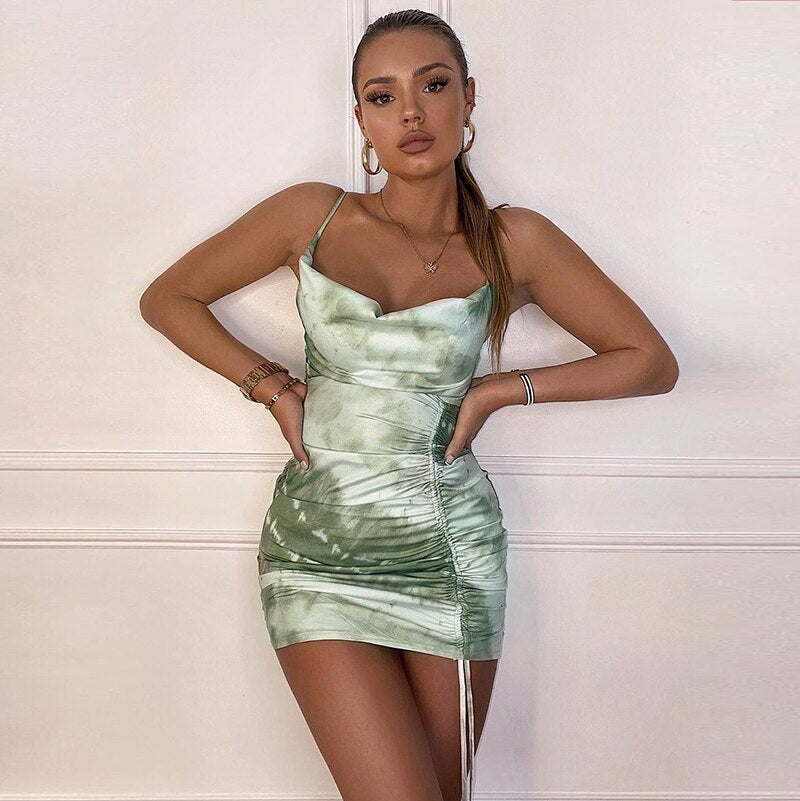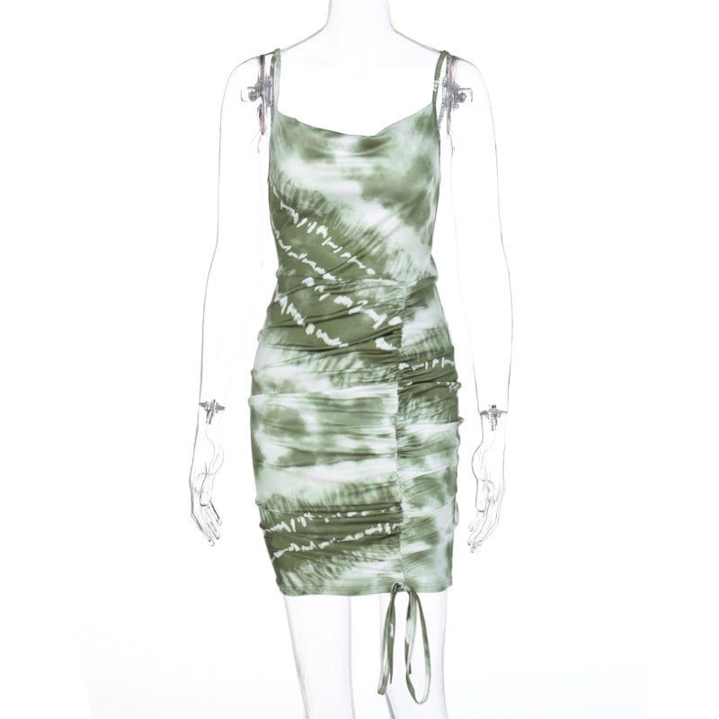 Hugcitar 2020 sleeveless ruched bandage tie dye print sexy mini dress summer women fashion streetwear outfits sundress
