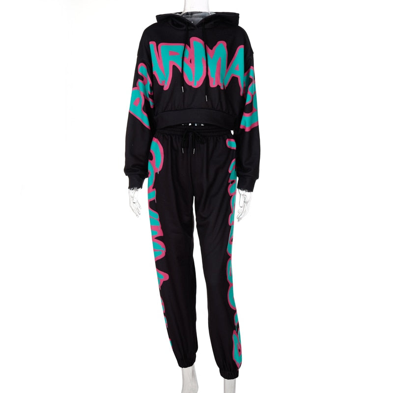 Hugcitar 2021 Letter Print Hooded Drawstring Sweatshirt Sweatpants 2 Piece Set Autumn Winter Women Fashion Streetwear Outfits