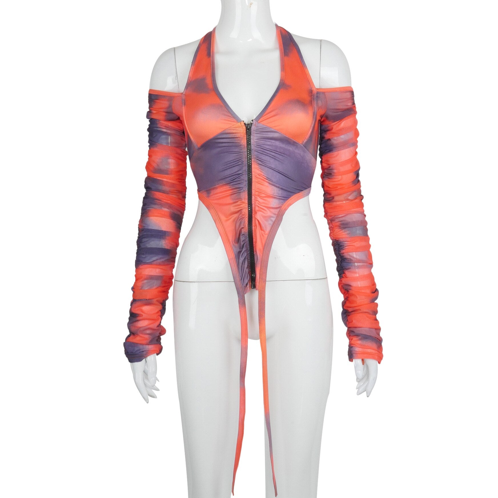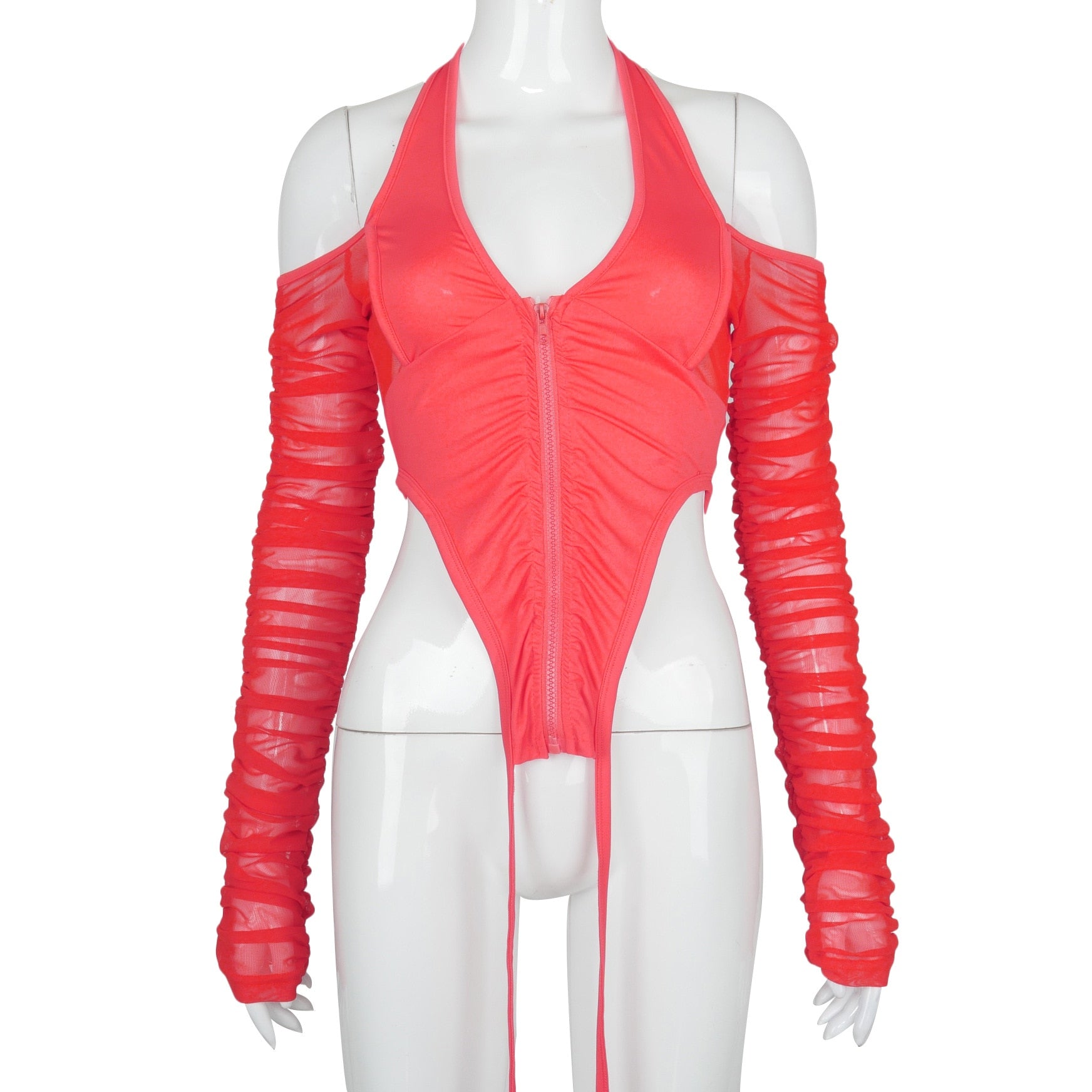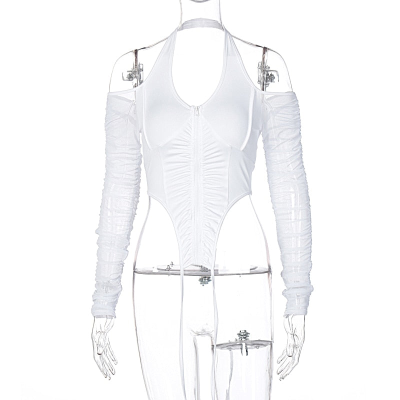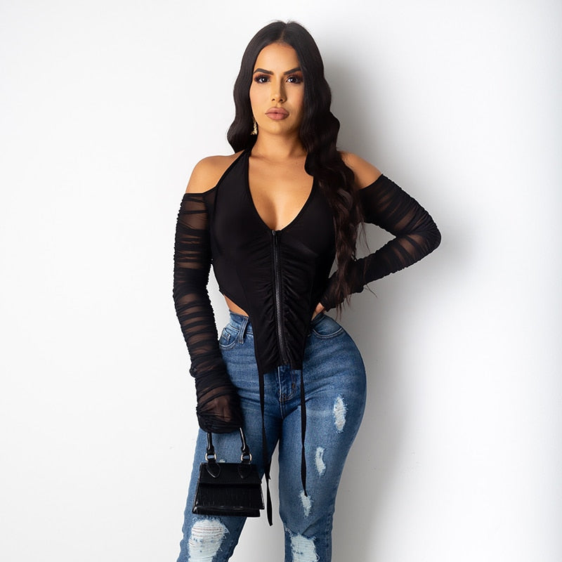Hugcitar 2021 Long Stacked Sleeve Halter Zipper Patchwork Sexy Crop Top Autumn Winter Women Fashion Streetwear Tshitrs Club Tees