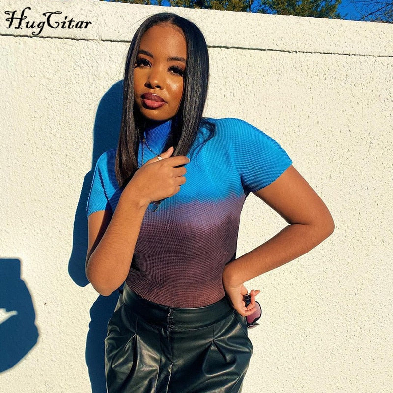 Hugcitar 2021 Short Sleeve O-Neck Gradient Summer Women Fashion Streetwear Tshirts Y2K Tees