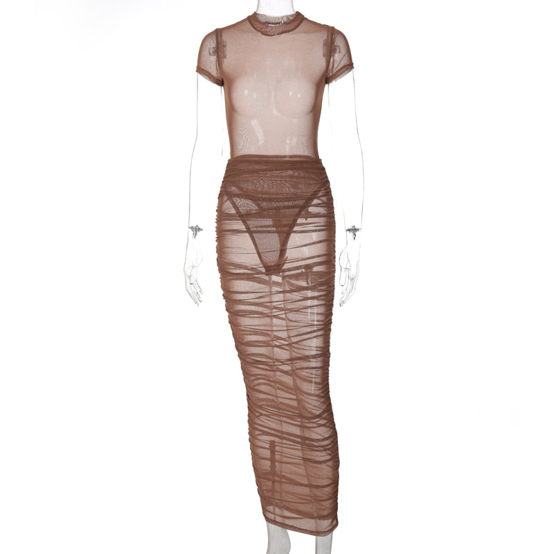 Hugcitar 2021 Short Sleeve Patchwork Gathered See Through Top Dress 2 Pieces Set Summer Women Fashion Streetwear Outfits Y2K