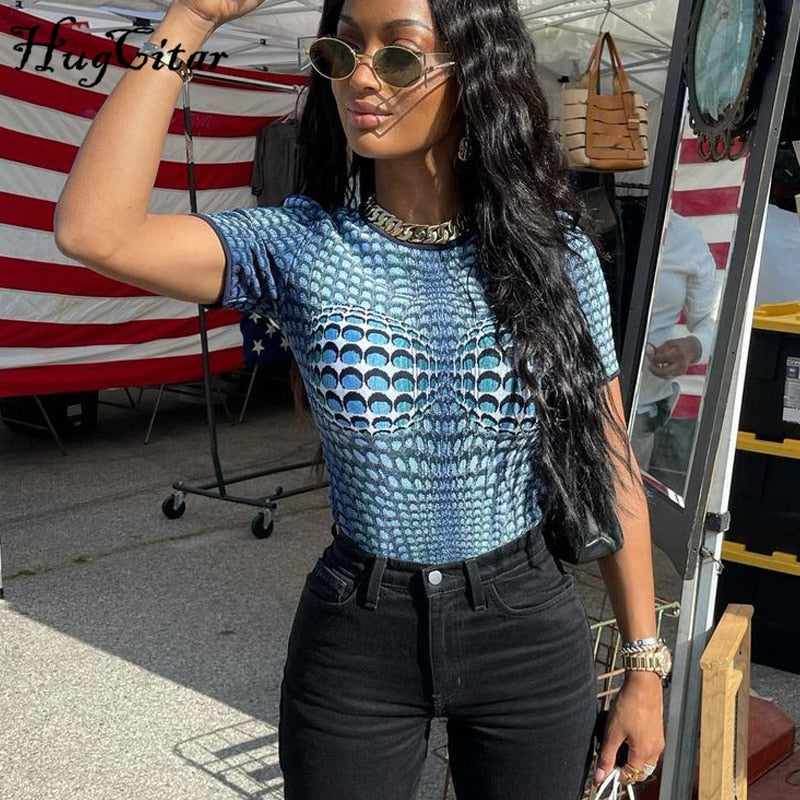 Hugcitar 2021 Short Sleeves Sexy Bodycon O Neck T Shirt Summer Women Fashion Club Snake Print Club Clothes Y2K Robe Beach