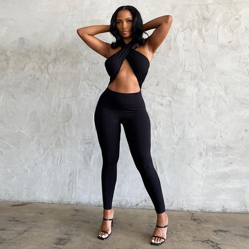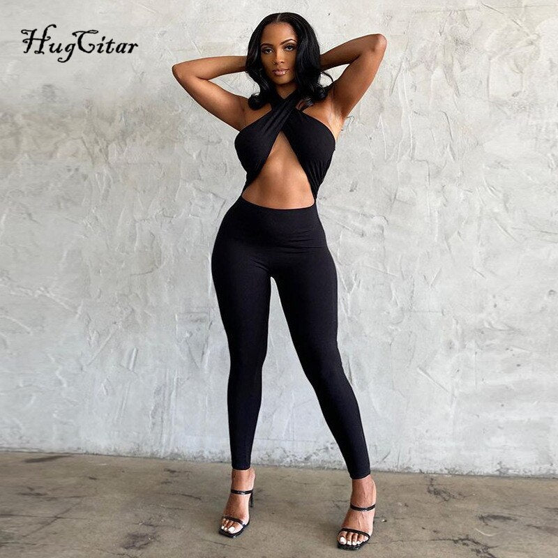 Hugcitar 2021 Sleeveless Solid Halter Bandage Hollow Out Sexy Jumpsuit Summer Women Fashion Streetwear Outfits Club Romper