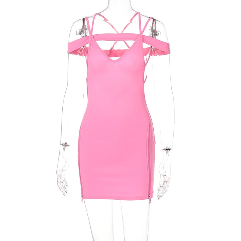 Hugcitar 2021 Solid Halter Bandage Slip Zipper Mini Dress Hollow Out Backless Bodycon Sexy Party Elegant Club Slim Y2K Robe