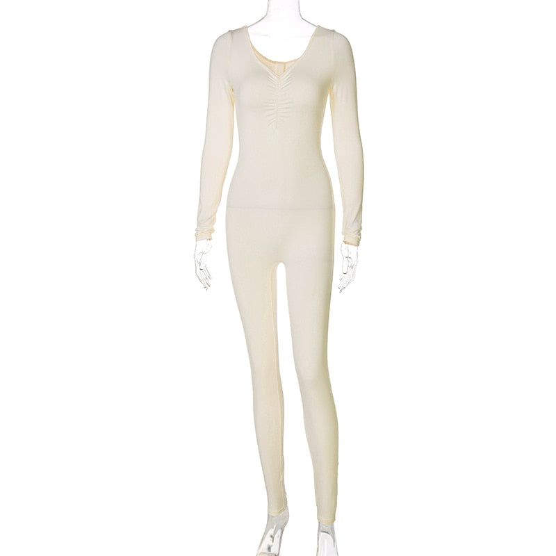 Hugcitar 2021 Solid Long Sleeve V Neck Bodycon Draped Sexy Jumpsuit Summer Autumn Women Fashion Streetwear Party Club Outfits