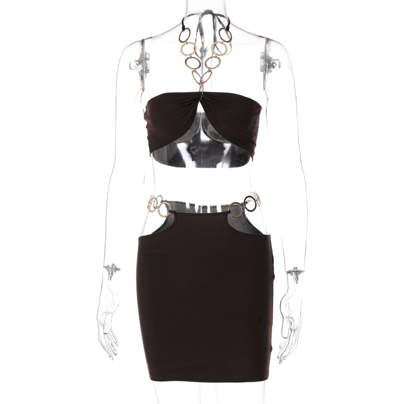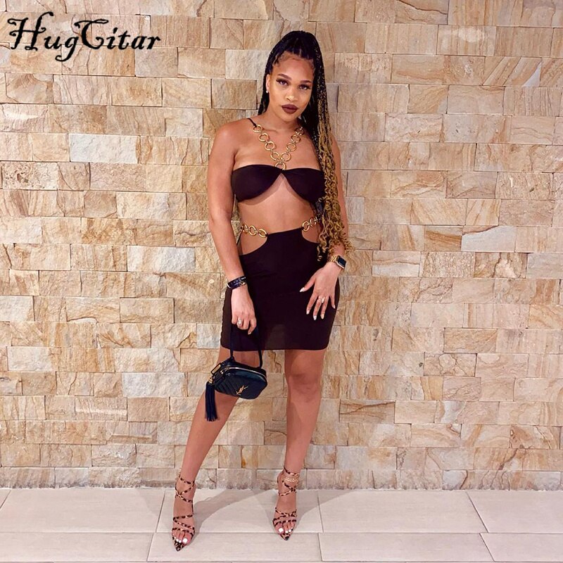 Hugcitar 2021 Solid Navel Ferrule Strapless Bodycon Top Sexy Mini Dress Set Summer Women Fashion Streetwear Club Party Y2K Robe