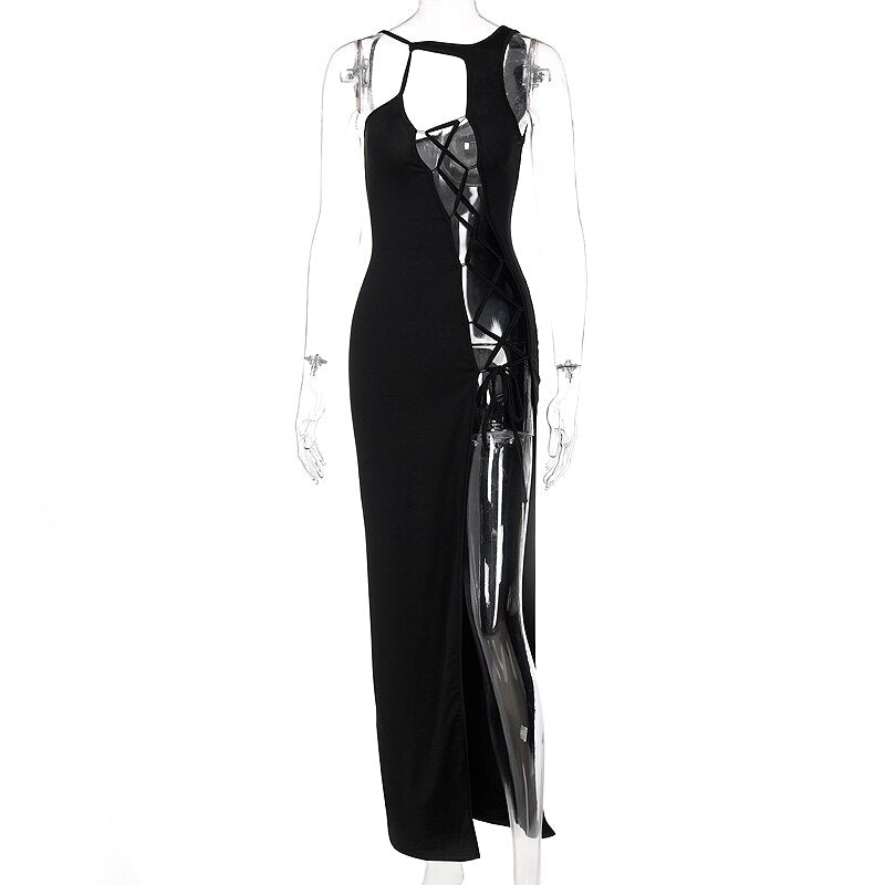 Hugcitar 2021 Summer Fall Women Fashion Halter Solid Hollow Out Bandage Bodycon Slim Dress Sexy Y2K Streetwear Revealing String