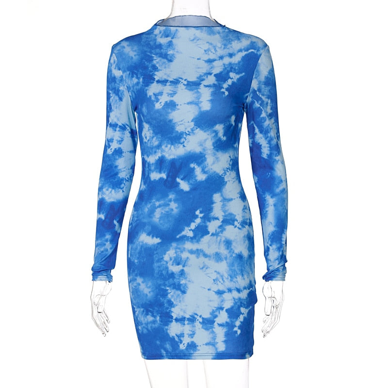 Hugcitar 2021 Tie Dye Long Sleeves Bodycon Slim Sexy Mini Dress Summer Autumn Women Fashion Y2K Streetwear