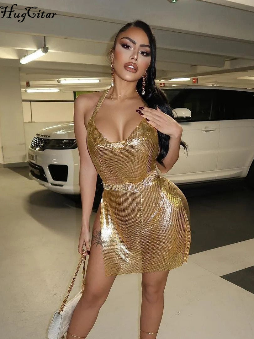 Hugcitar Bling Glitter Women Halter Mini Dress Side Slit Backless Bodycon Sexy Streetwear Party Club Festival 2022 Summer Clothe