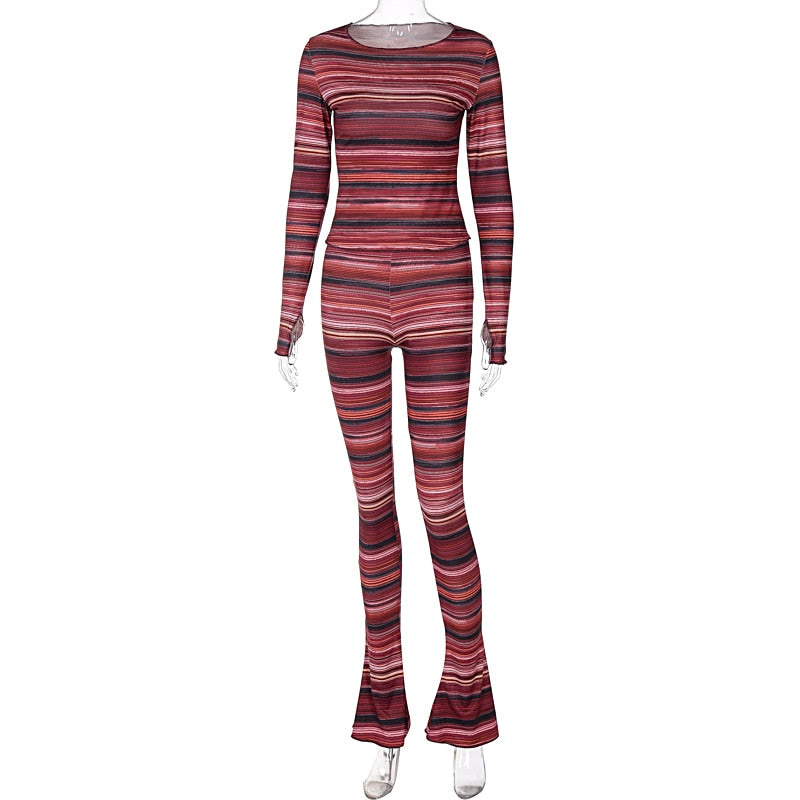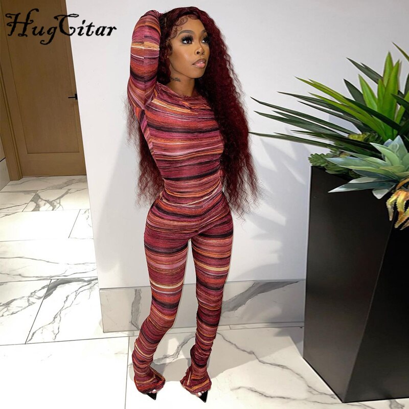 Hugcitar Bodycon Color Stripe Print Long Sleeve Crop Top High Waist Flare Leggings 2 Piece Set 2021 Women Fashion Tracksuit