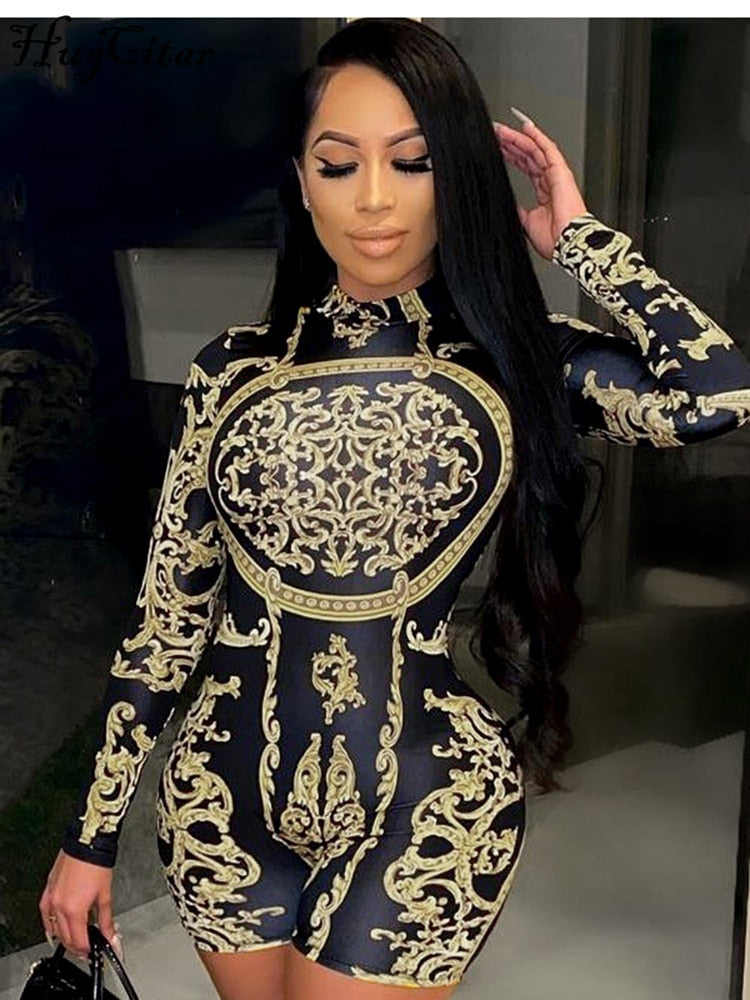 Hugcitar Classical Print O Neck Long Sleeve Playsuit 2022 New Year Sexy Slim Sports Elegant Casual Streetwear Concise Y2K