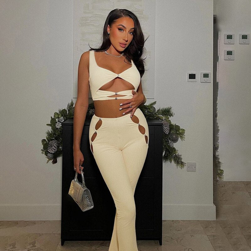 Hugcitar Diamond Halter Sleeveless Crop Top Hollow Out Flare Pants 2 Pcs Matching Set 2022 Evening Party Sexy Slim Elegant Y2K