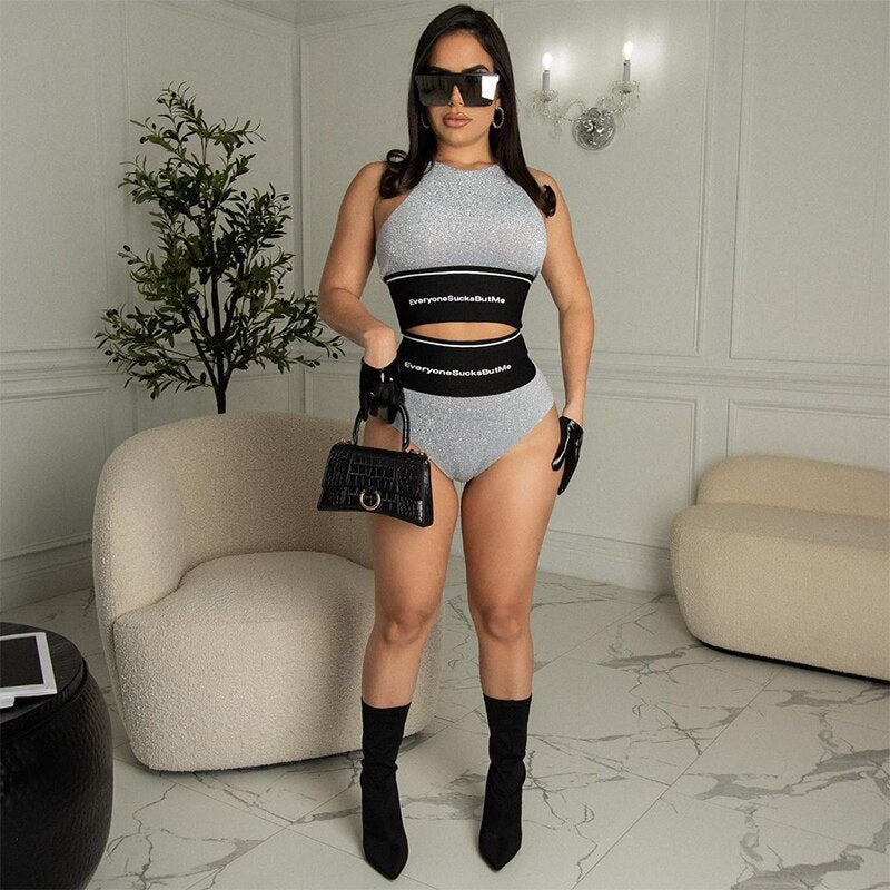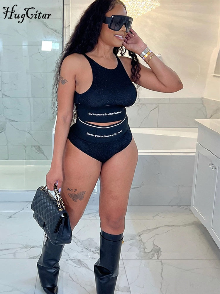 Hugcitar Letter Print Gold Wire Sleeveless Sexy Crop Top Mini Shorts 2 Pieces Suits 2021 Fall Women Fashion Streetwear