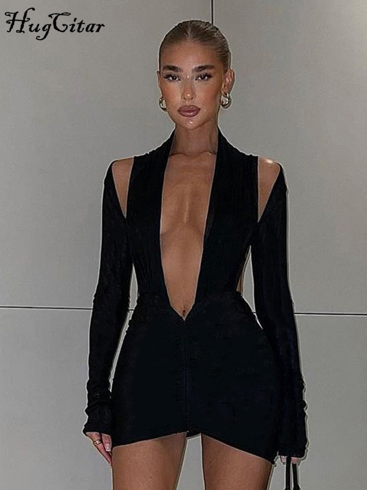 Hugcitar Long Sleeve Deep V Neck Hollow Out Ruched Mini Dress 2022 Bodycon Sexy Streetwear Party Club Clothes