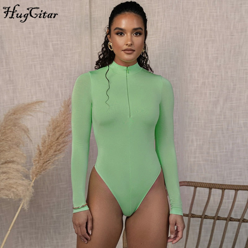Hugcitar long sleeve front zipper v neck women sexy body 2020 autumn winter high stretchy basic bodysuit