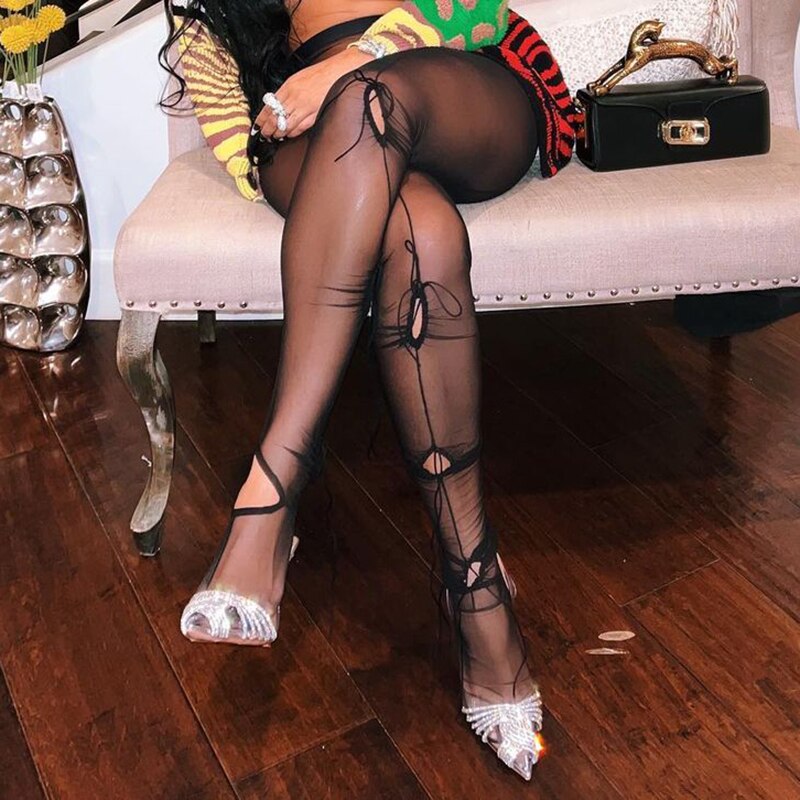 Hugcitar Mesh Solid See Through Cut Out Bandage High Waist Leggings 2022 New Fashion Bodycon Sexy Streetwear Party Club Y2K