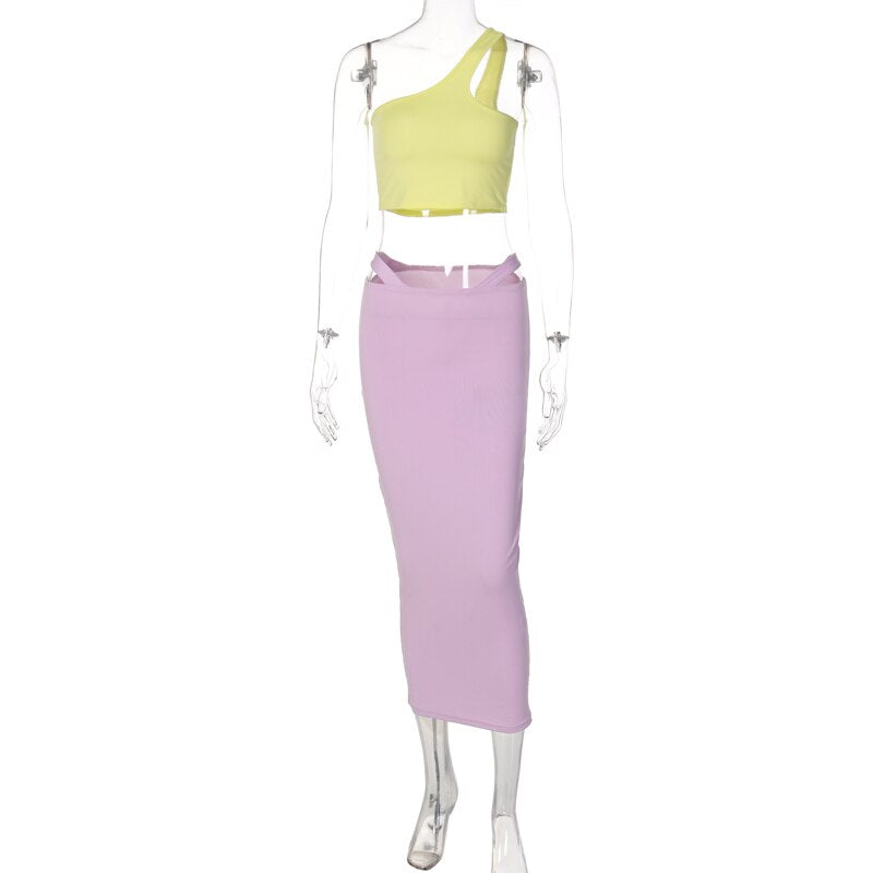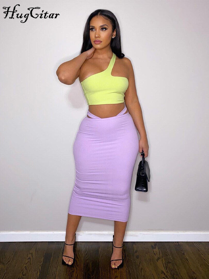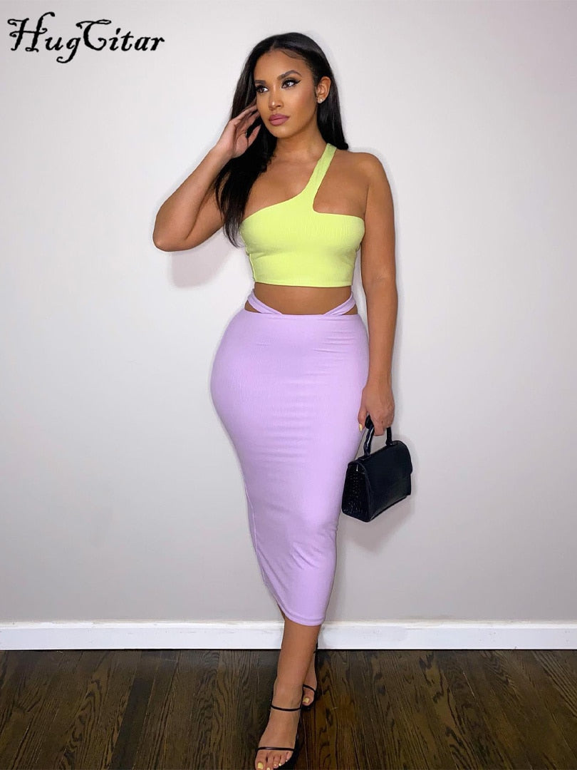 Hugcitar One Shoulder Yello Crop Top Purple Skirt Prom Dress 2 Pcs Matching Set Bodycon 2022 Summer Women Outfit Beach Elegant