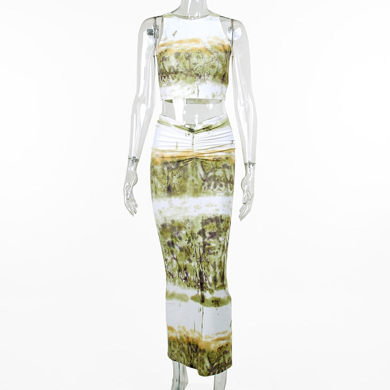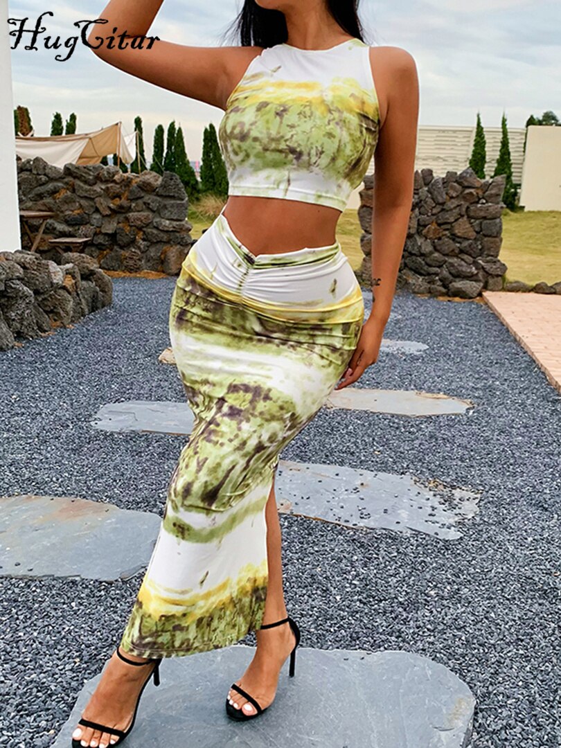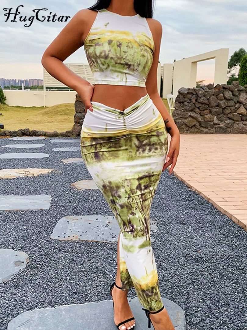 Hugcitar Print Sleeveless Crop Top High Waist Ruched Maxi Dress 2 Pcs Matching Set 2021 Fall Bodycon Party Elegant Vestidos