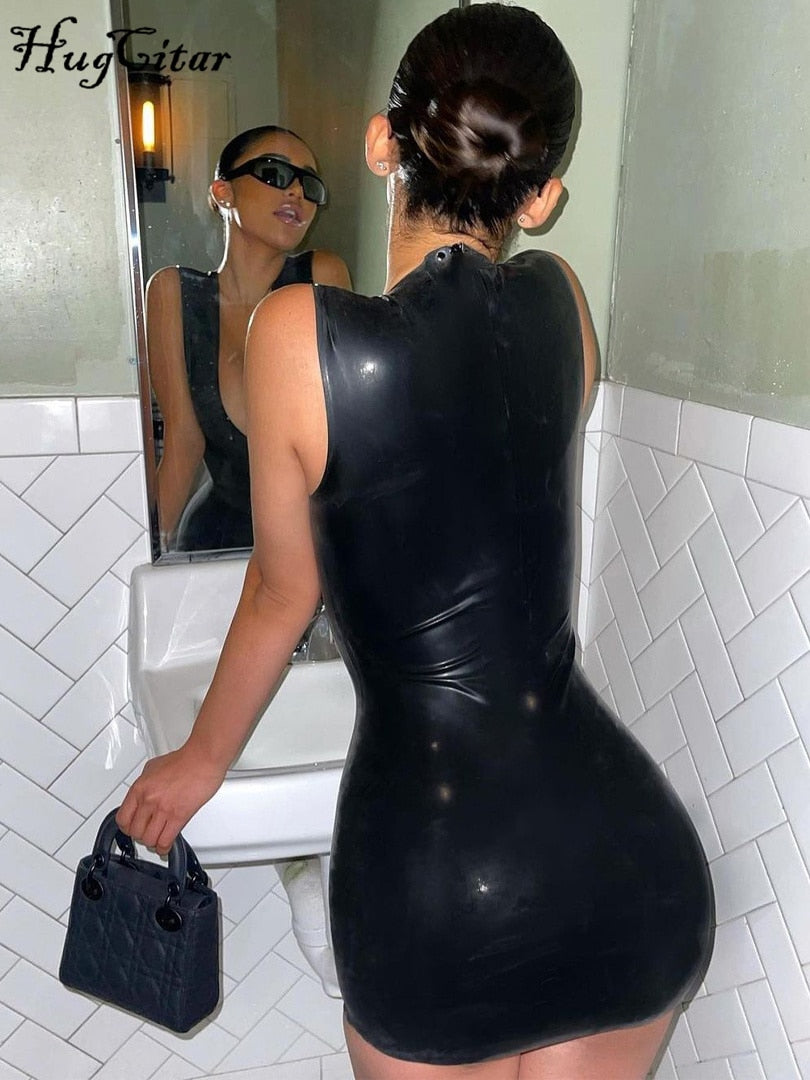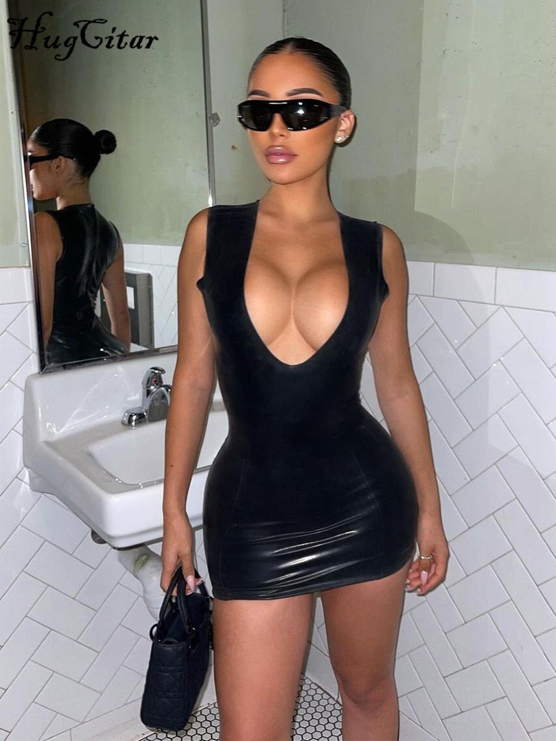 Hugcitar Pu Leather V Neck Sleeveless Bodycon Slim Sexy Revealing Mini Dress 2021 Fall Winter Women Christmas Halloween Party