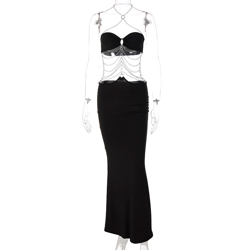 Hugcitar Pure Color Chain Halter Bandage Long Sleeve Backless Revealing Slim Maxi Dress 2021 Fall Women Fashion Elegant Y2K