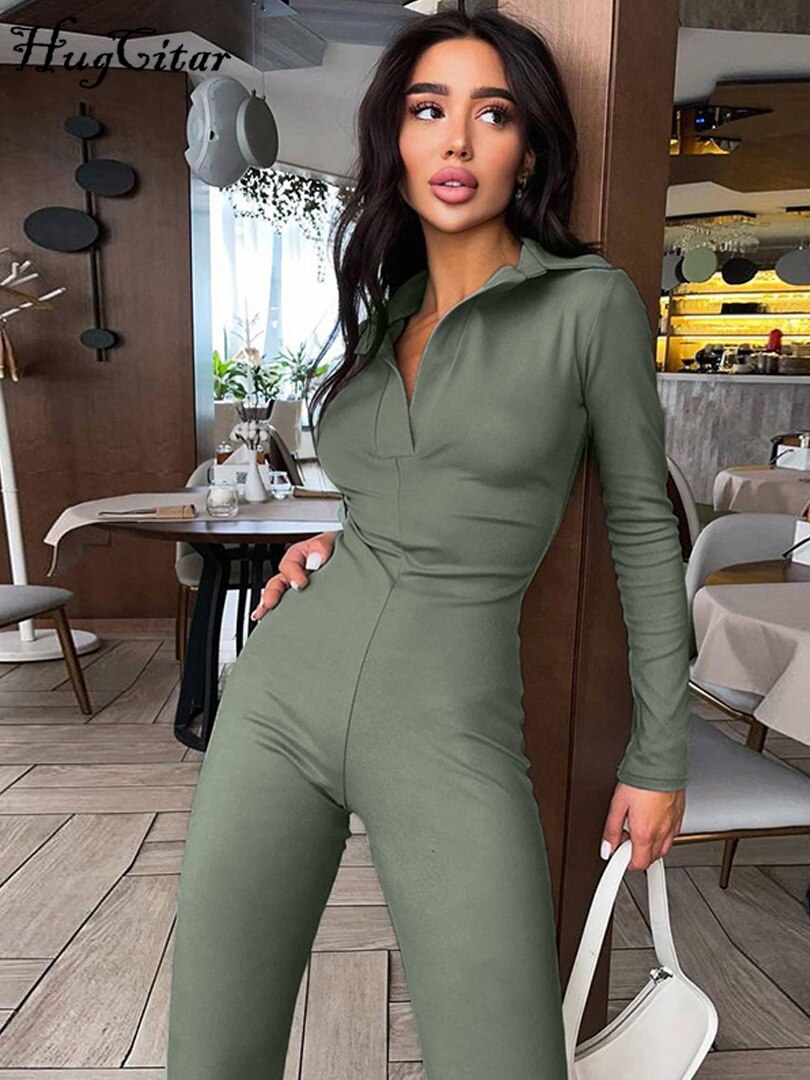 Hugcitar Pure Color Polo Neck High Waist Flare Leggings Jumpsuit 2021 Autumn Women Stretch Sexy Streetwear Casual