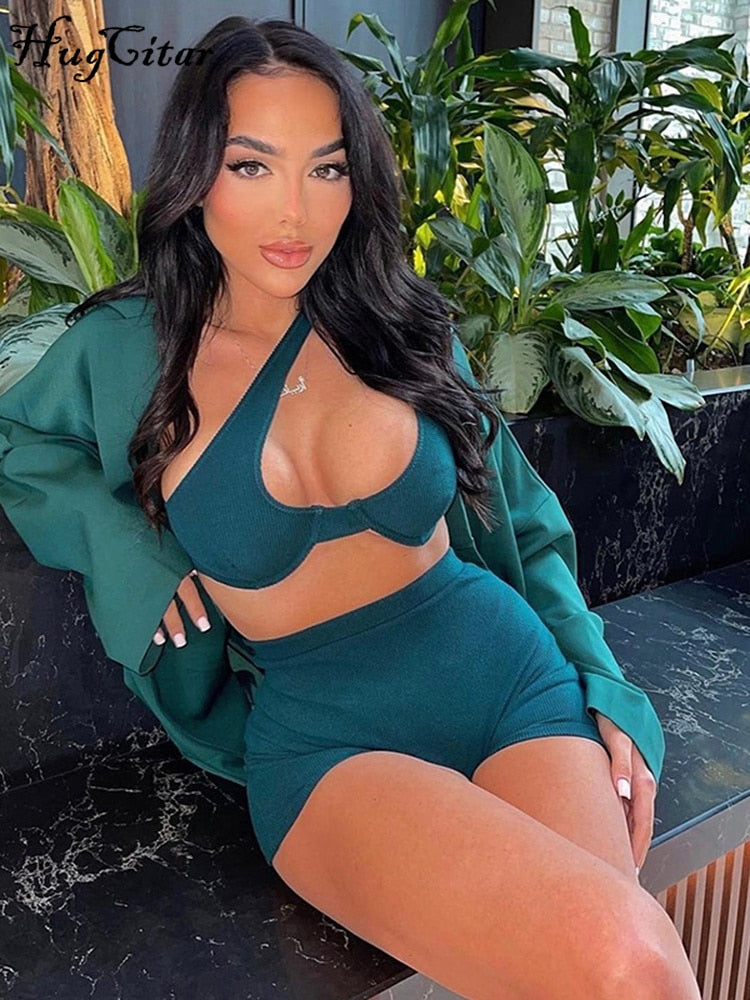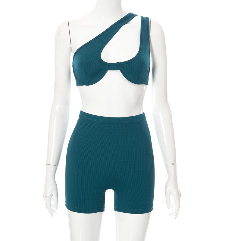 Hugcitar Ribbed Diagonal Collar Sleeveless Hollow Out Crop Top Mini Shorts 2 Pcs Set 2022 Sexy Women Streetwear Y2K Party Club