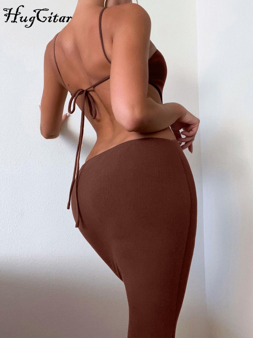 Hugcitar Ribbed Halter Hollow Out Backless Skinny Maxi Dress 2022 Bodycon Sexy Streetwear Evening Party Club Elegant Clothing