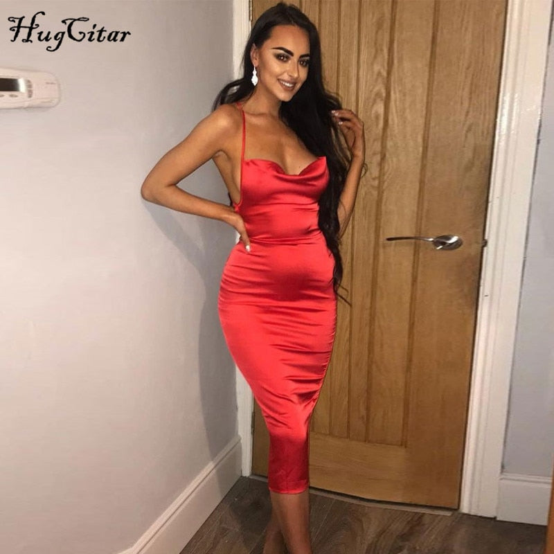 Hugcitar satin slip high waist neon backless sexy bodycon midi dress 2019 summer women fashion party elegant sleeveless clothes