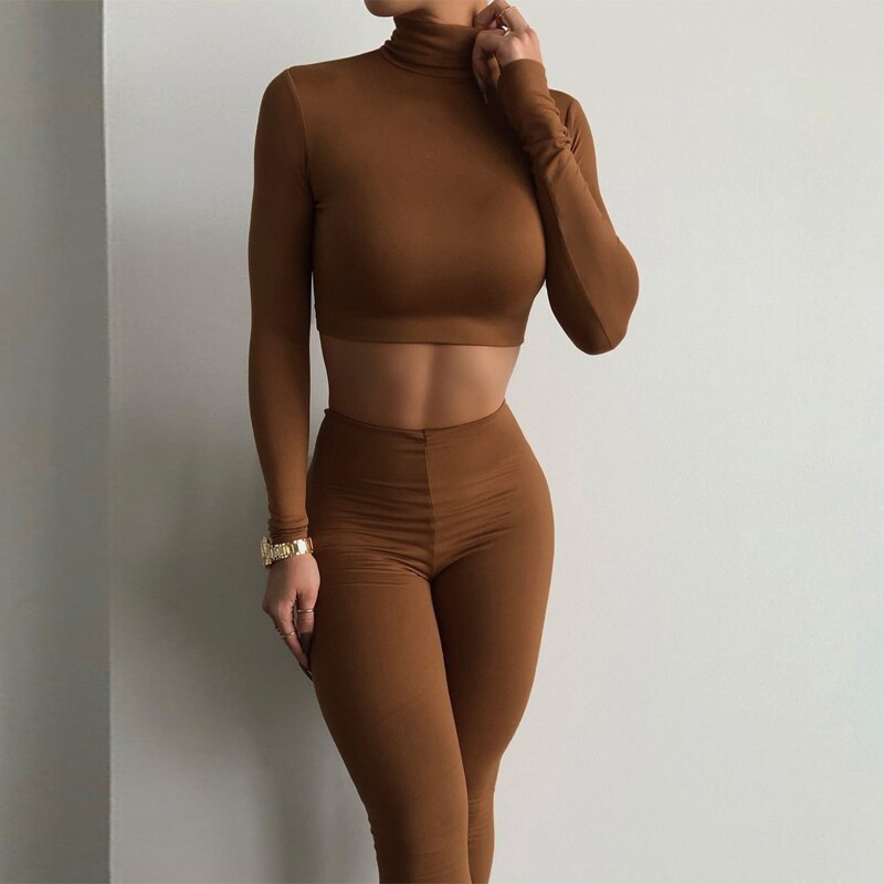 Hugcitar Satin Turtle Neck Crop Top High Waist Slim Leggings 2 Pcs Matching Sets 2021 Fall Women Fashion Streetwear Tracksuit