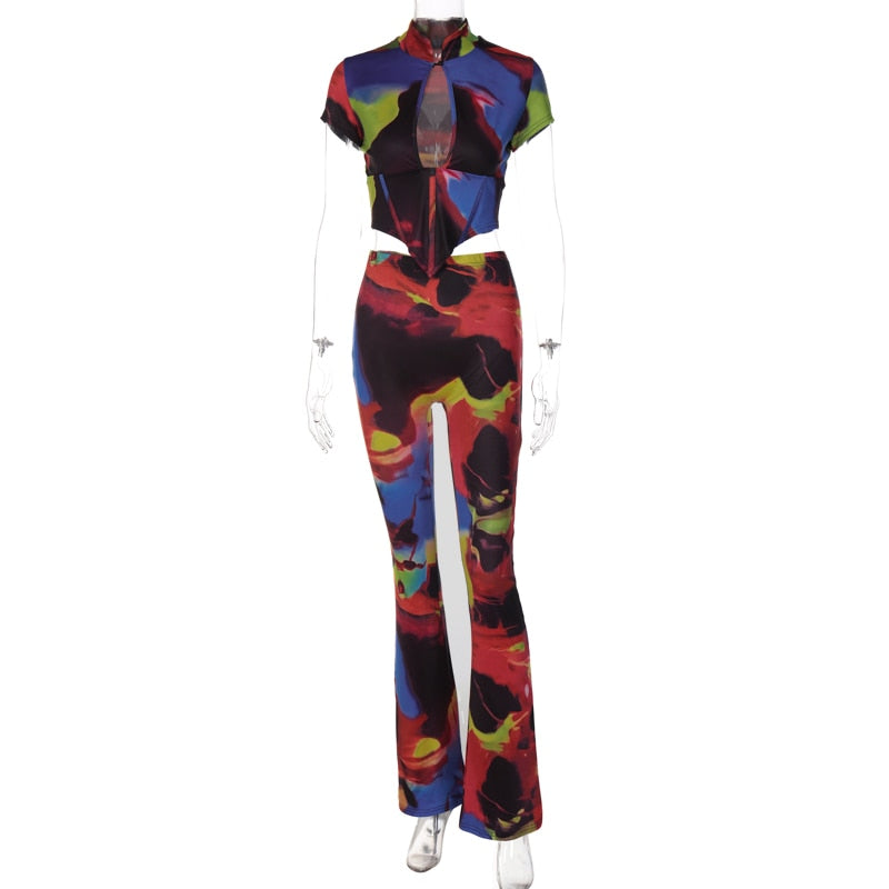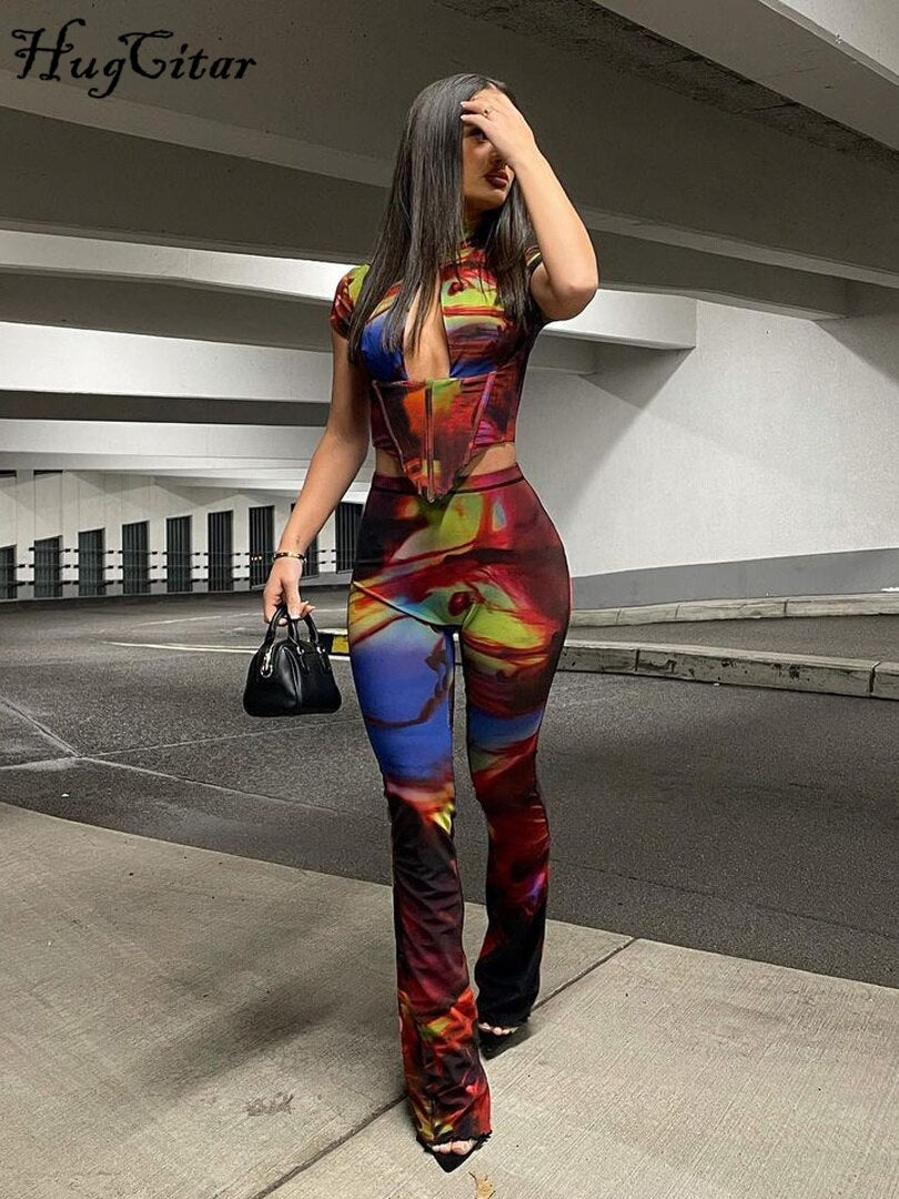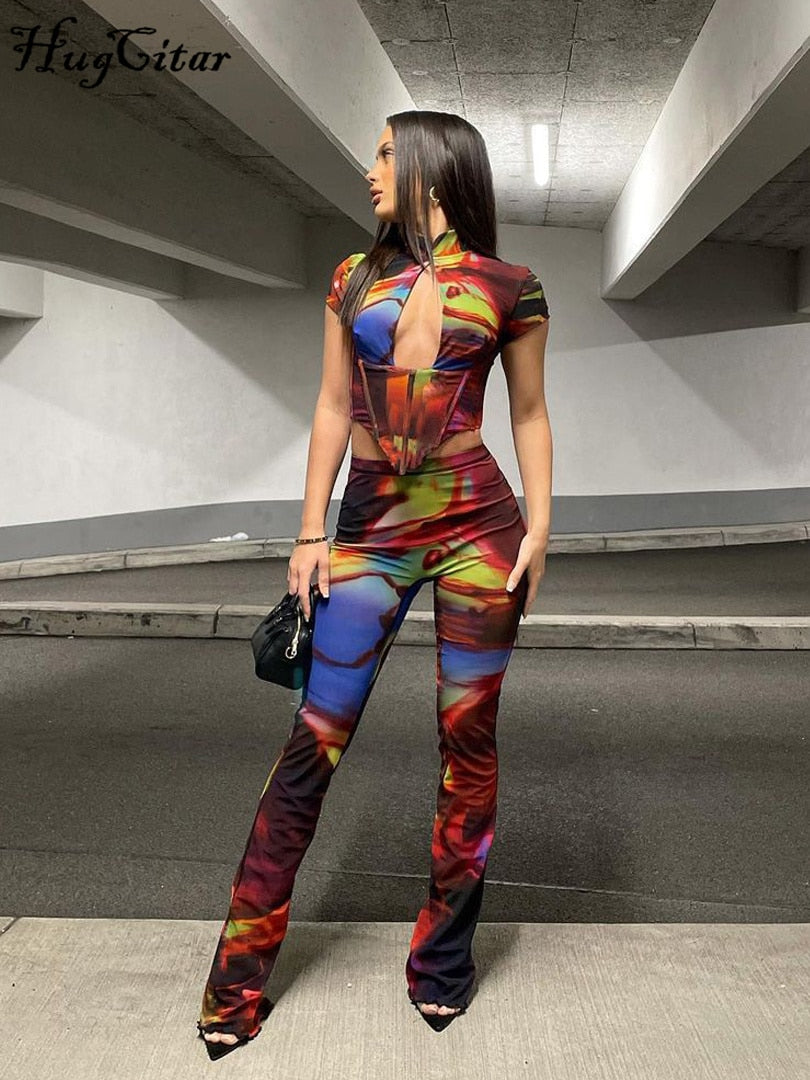 Hugcitar Short Sleeves Print Hollow Out Top Flare Pants 2 Pieces Suits 2021 Fall Women Bodycon Sexy Streetwear Outfits