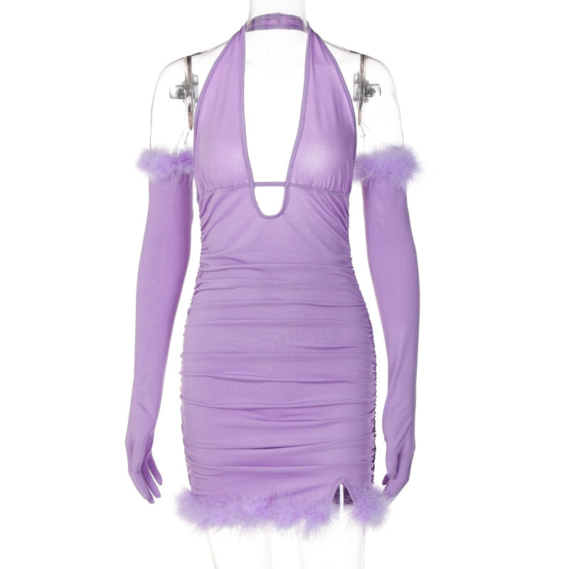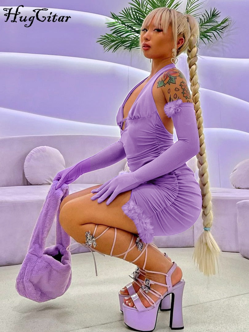 Hugcitar Solid Flocking Off Shoulder Long Detachable Sleeve With Gloves Mini Dress 2022 Evening Party Bodycon Elegant Fashion