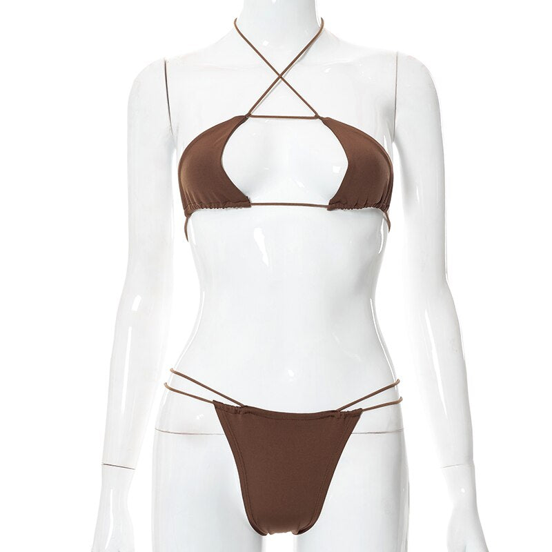 Hugcitar Solid Halter Bandage Hollow Out Sexy Bra Swimsuit 2 Pieces Set 2022 Summer Holiday Beach Revealing Outfits Y2K