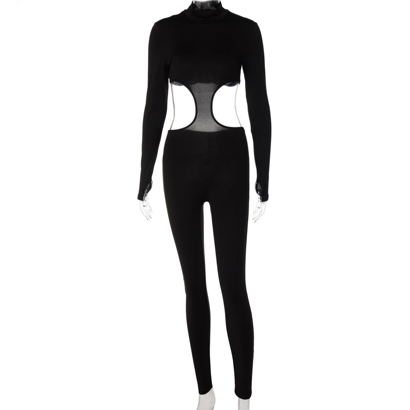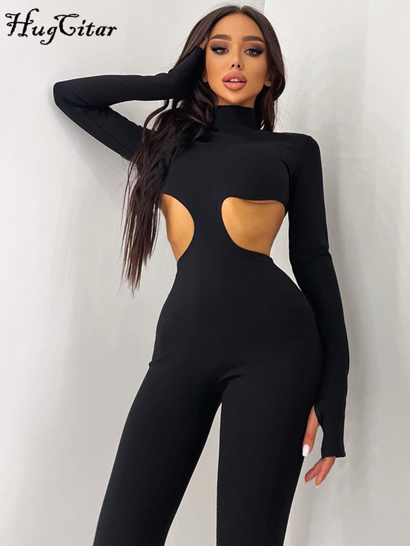 Hugcitar Solid Long Sleeve Turtleneck Hollow Out Jumpsuit 2021 Summer Fall Bodycon Party Club Elegant Streetwear Outfit Y2K