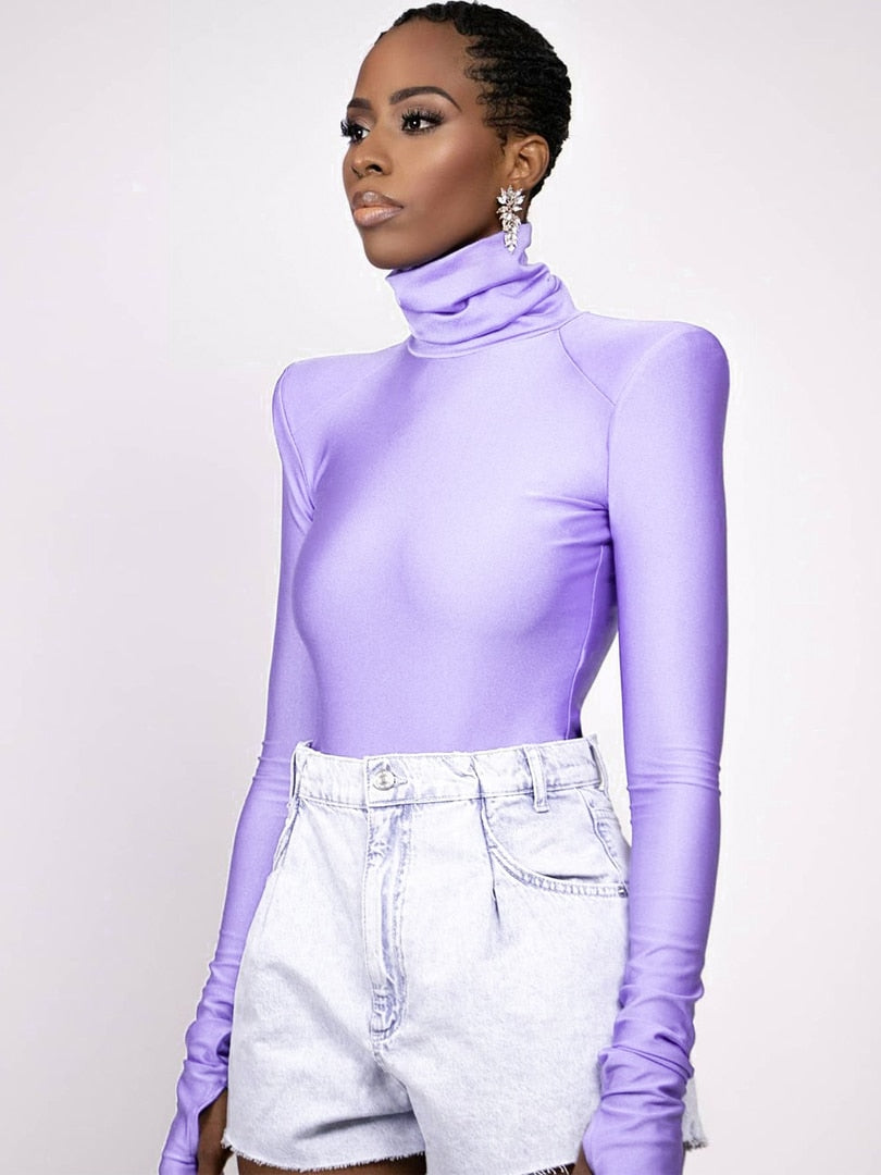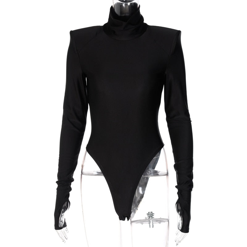 Hugcitar Solid Satin Long Sleeves With Shoulder Pads Turtleneck Slim Bodycon Sexy Bodysuit 2021 Fall Winter Women Party Y2K