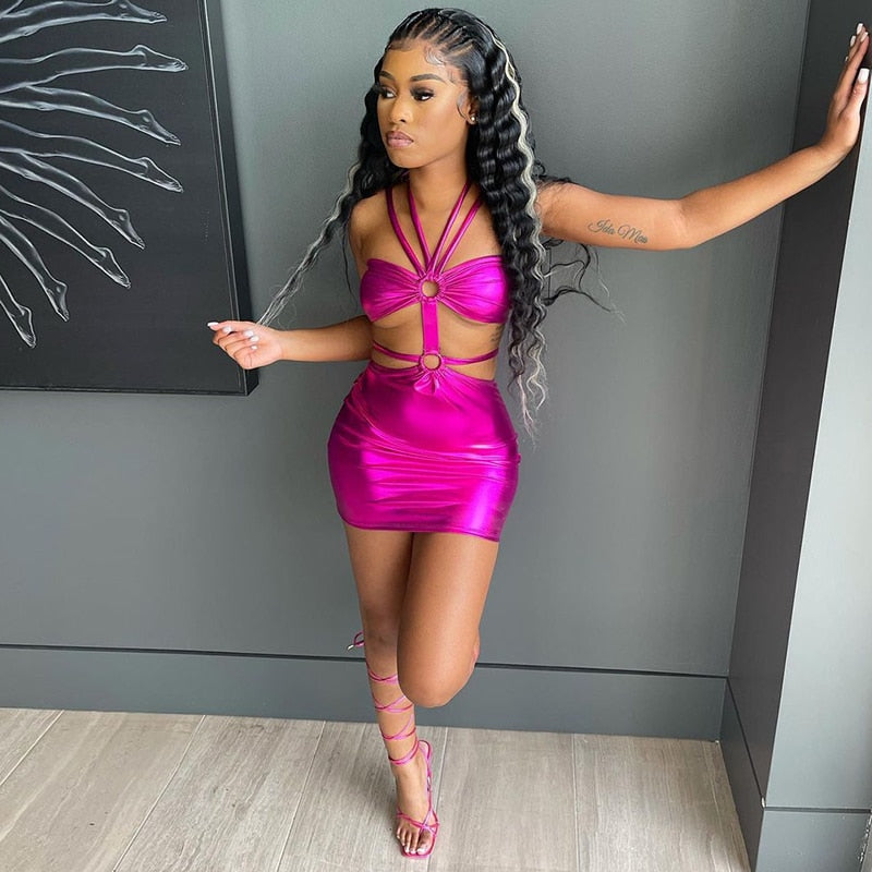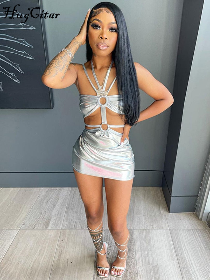 Hugcitar Solid Sleeveless Bodycon Halter Hollow Out Sexy Mini Dress 2021 Summer Women Fashion Streetwear Outfits Y2K