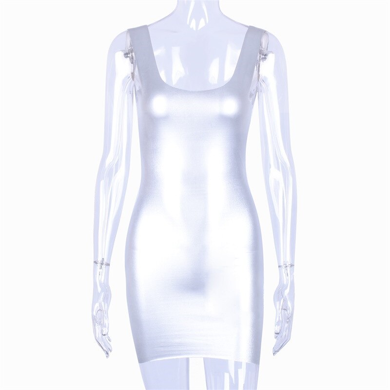 Hugcitar spaghetti straps silver reflective sexy bodycon mini dress 2019 summer women party club streetwear sleeveless clothes