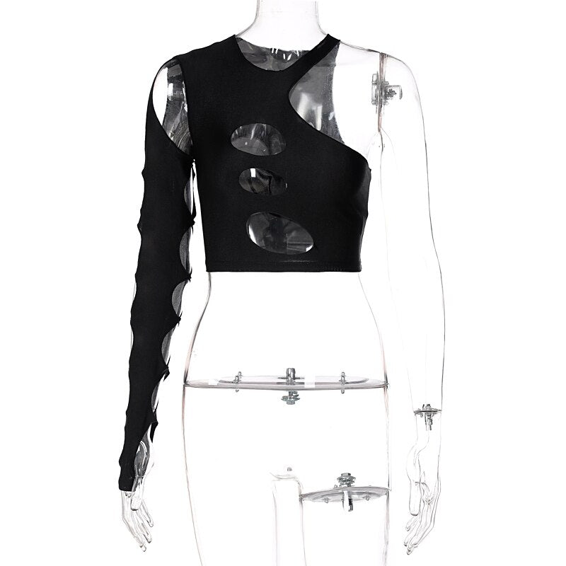 Hugcitar Women Solid Single Shoulder Long Sleeves Hollow Out Crop Top 2021 Summer Autumn Fashion Streetwear Elegant Y2K
