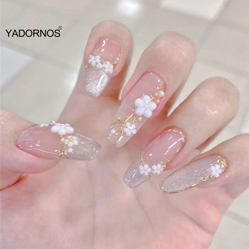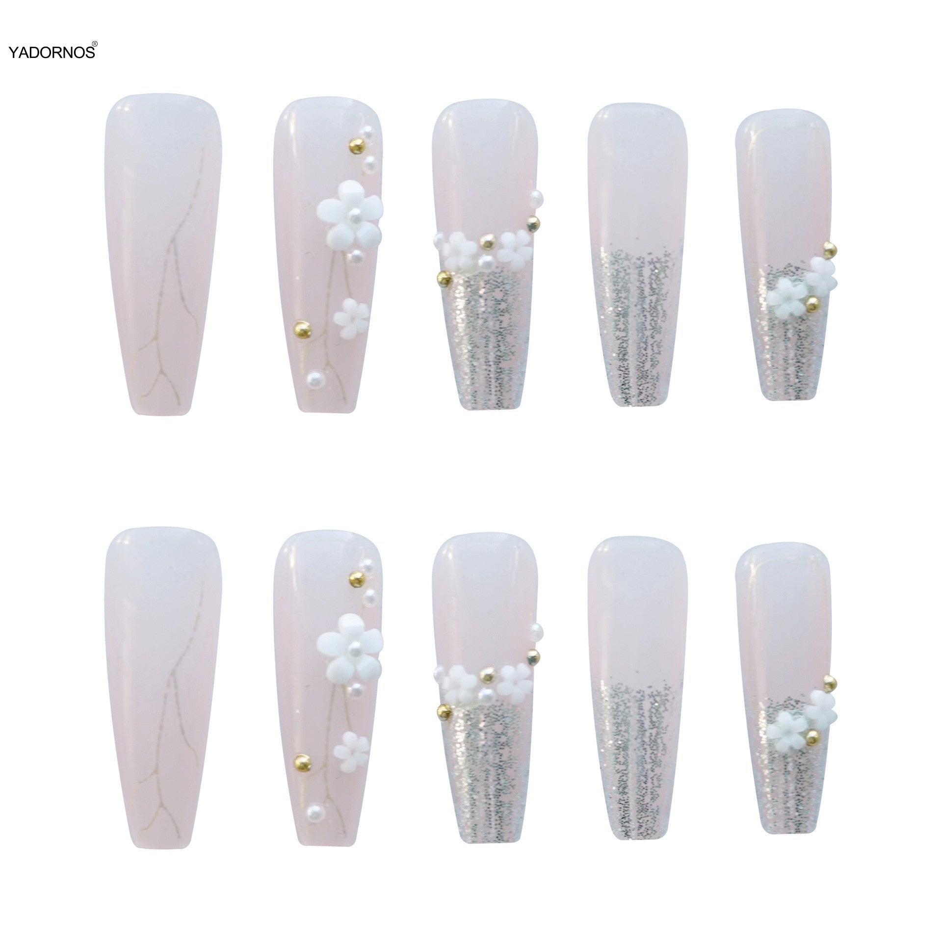 Japanese Nail Sticker Long Pointed Head Nails White Flower Print Nail Art Finished Nail Piece 24pcs Glue Type Best Gifts Ty-Nail Inspo