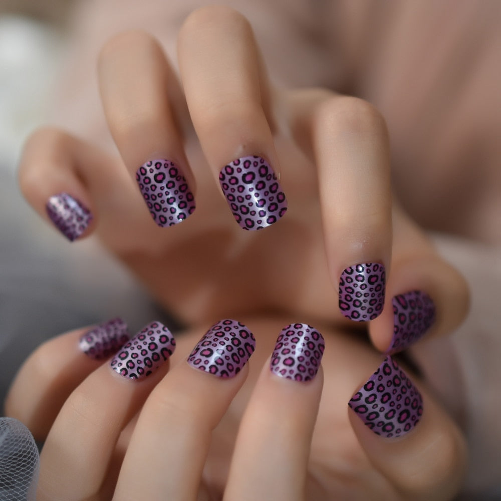 Kids Nail Art Tips Purple Pink Leopard Pattern Girl False Nails Small Size Student's Gift-Nail Inspo