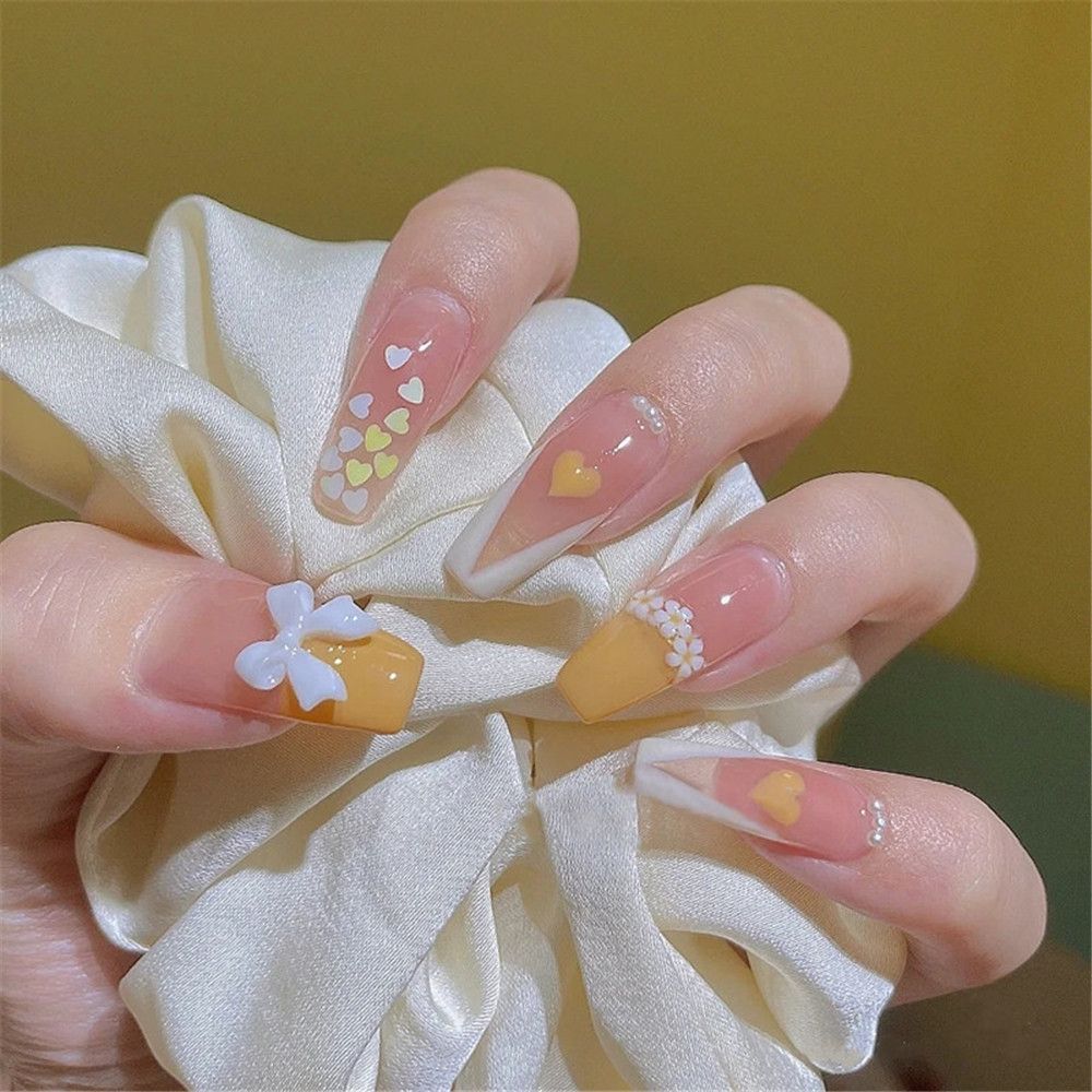 Looks cute on my nails. I had to adjust them according to my nail sizes. The glue fixed them tightly to the nail so far( the second day yet). I applied some top coat for extra shine.