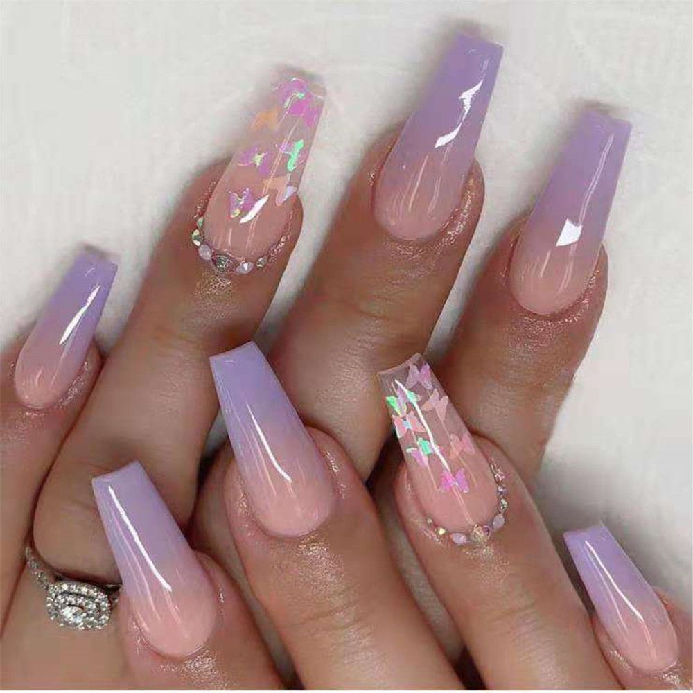 Lilac gradient Butterfly Pattern Fake Nails Full cover False Nails Extra Long Ballerina Coffin Nails Manicure Nail Art Tools-Nail Inspo