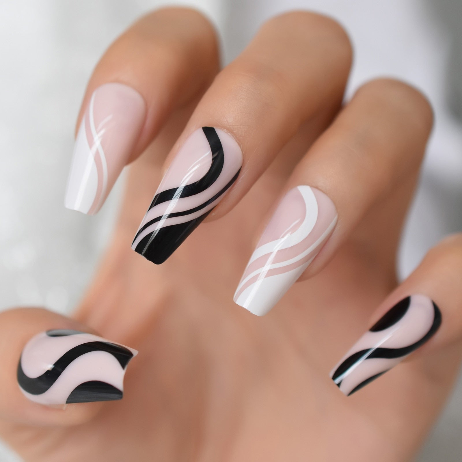 Long Coffin False Press On Nails Pink Black White Abstract Swirl Fake Nails Ballerina Full Cover Gel Glossy Acrylic Nail Tips-Nail Inspo
