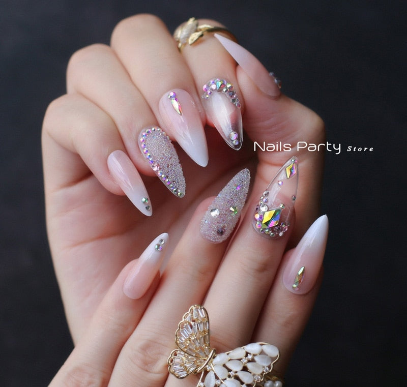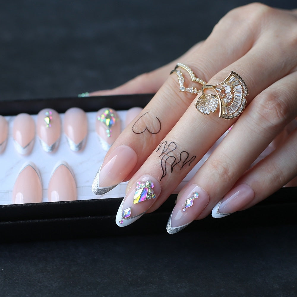 Luxury crystal cute New design Glitter V french Almond Fake nails nude Natural False nails with box press on nails-Nail Inspo