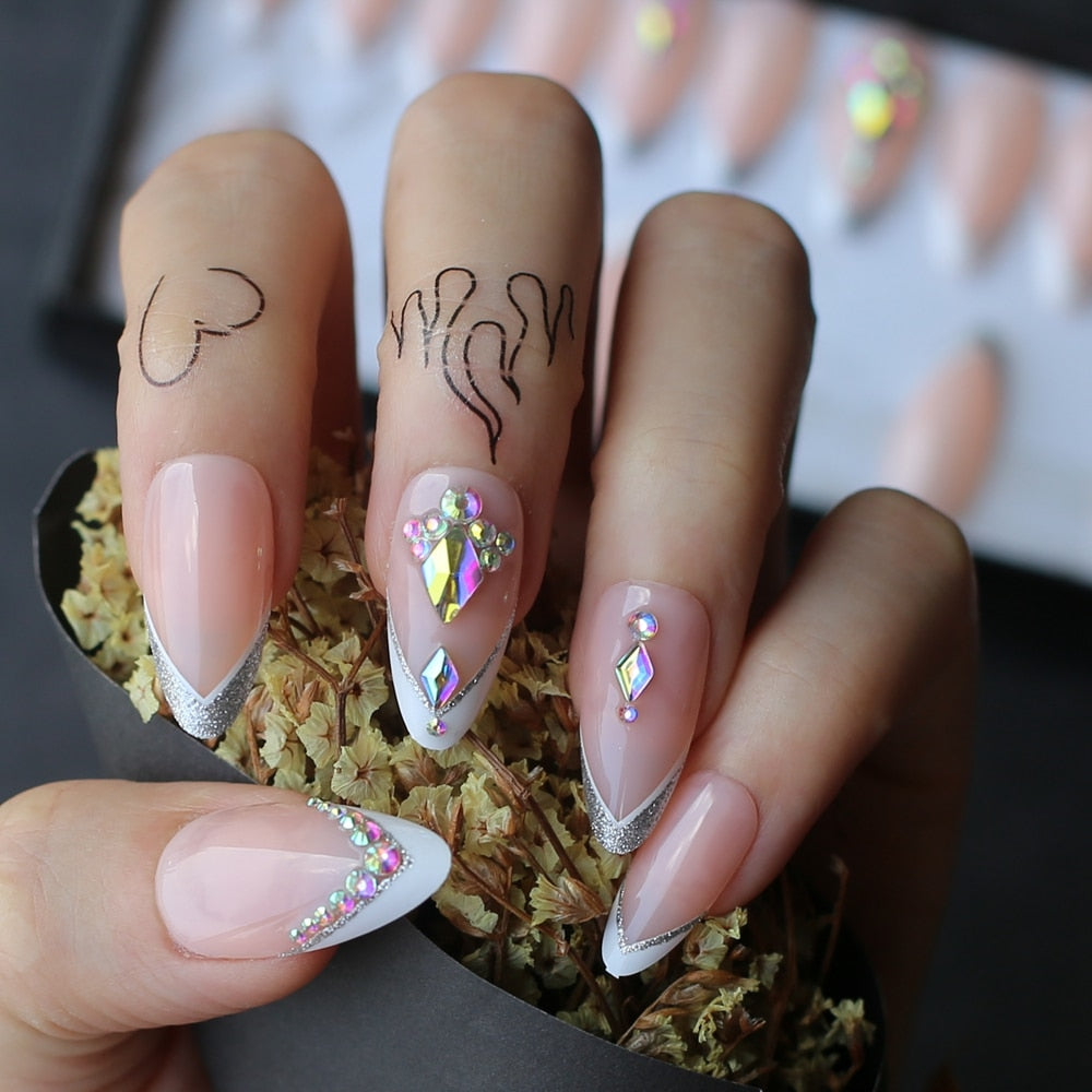Luxury crystal cute New design Glitter V french Almond Fake nails nude  Natural False nails with box press on nails-Nail Inspo