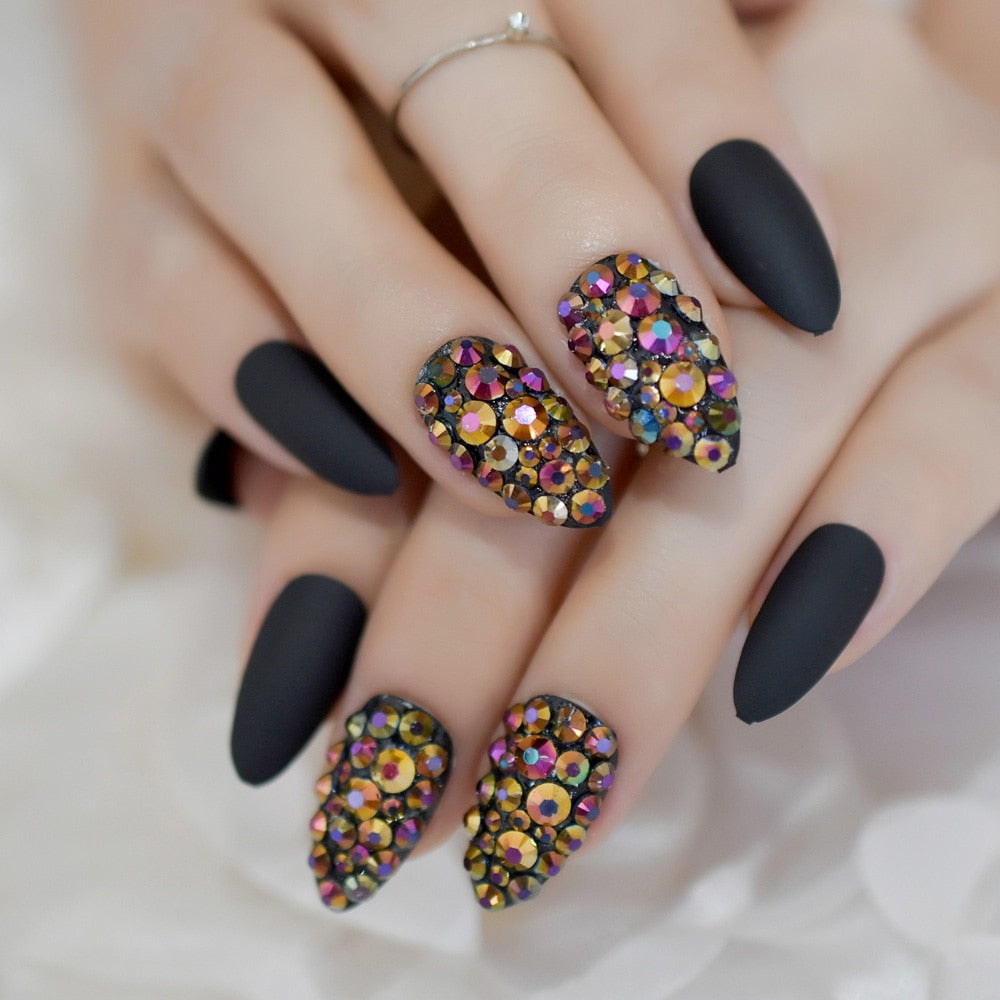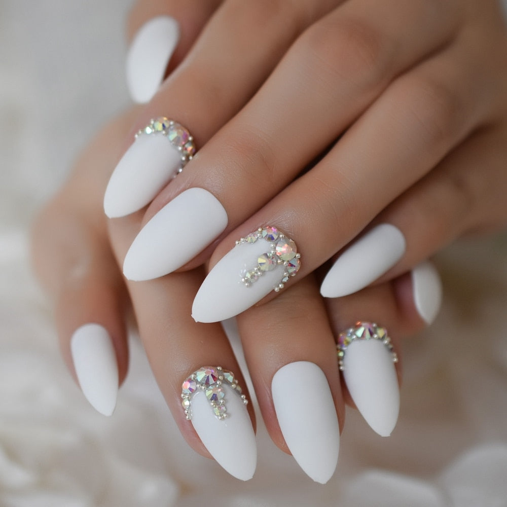 Matte Custom Fake Nails Craft White Decorative Luxury Nails Stiletto Rhinestones Designed Fingernails with Glue sticker 24pcs-Nail Inspo