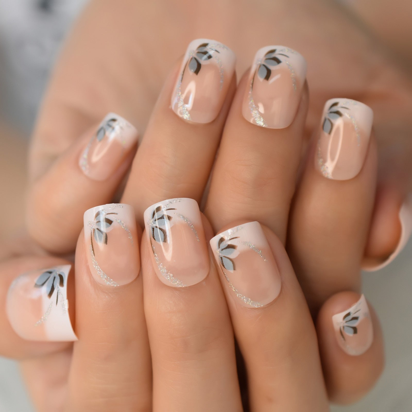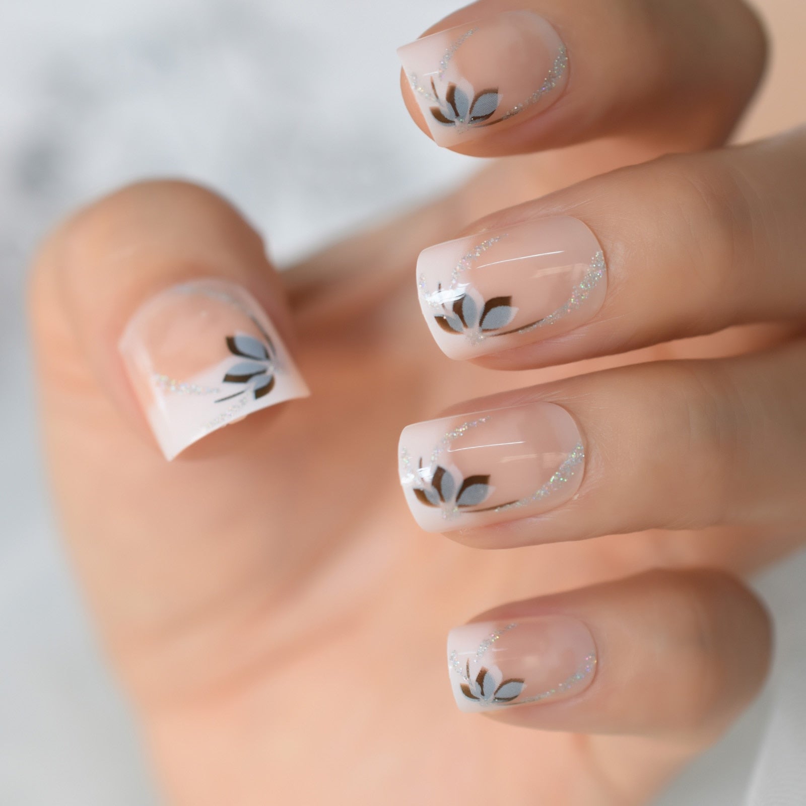 Medium Nude Natural False Nails Square Shimmer Glitter Decorative Flower Grace White Gradient Ombre Artificial Nail Art Tips-Nail Inspo