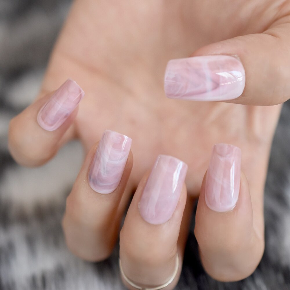 Medium size Marble Fake Nails Square Dark Pink Ladies Acrylic DIY Nail Art Tips Pre-designed Nails with Glue sticker-Nail Inspo